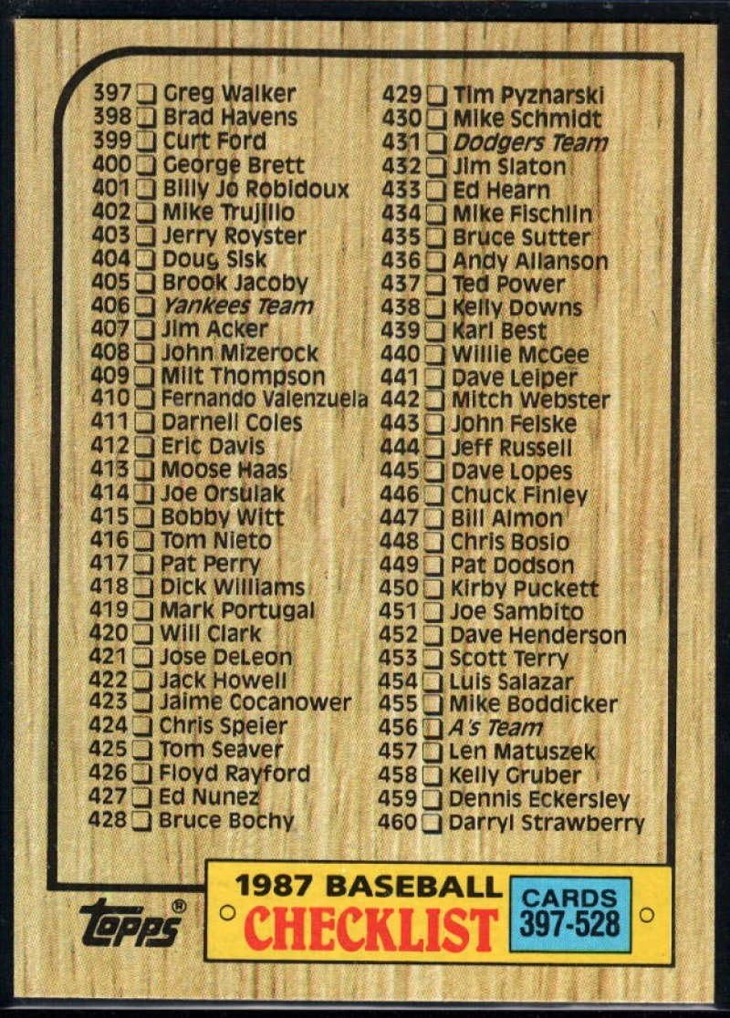1987 topps baseball cards checklist. The set consisted of 132 baseball cards and each card from the 1987 topps traded tiffany baseball card set is listed below. The set also includes manager cards with team checklist featured on the card backs. 1987 topps baseball checklist cards (6) lists all cards in set: